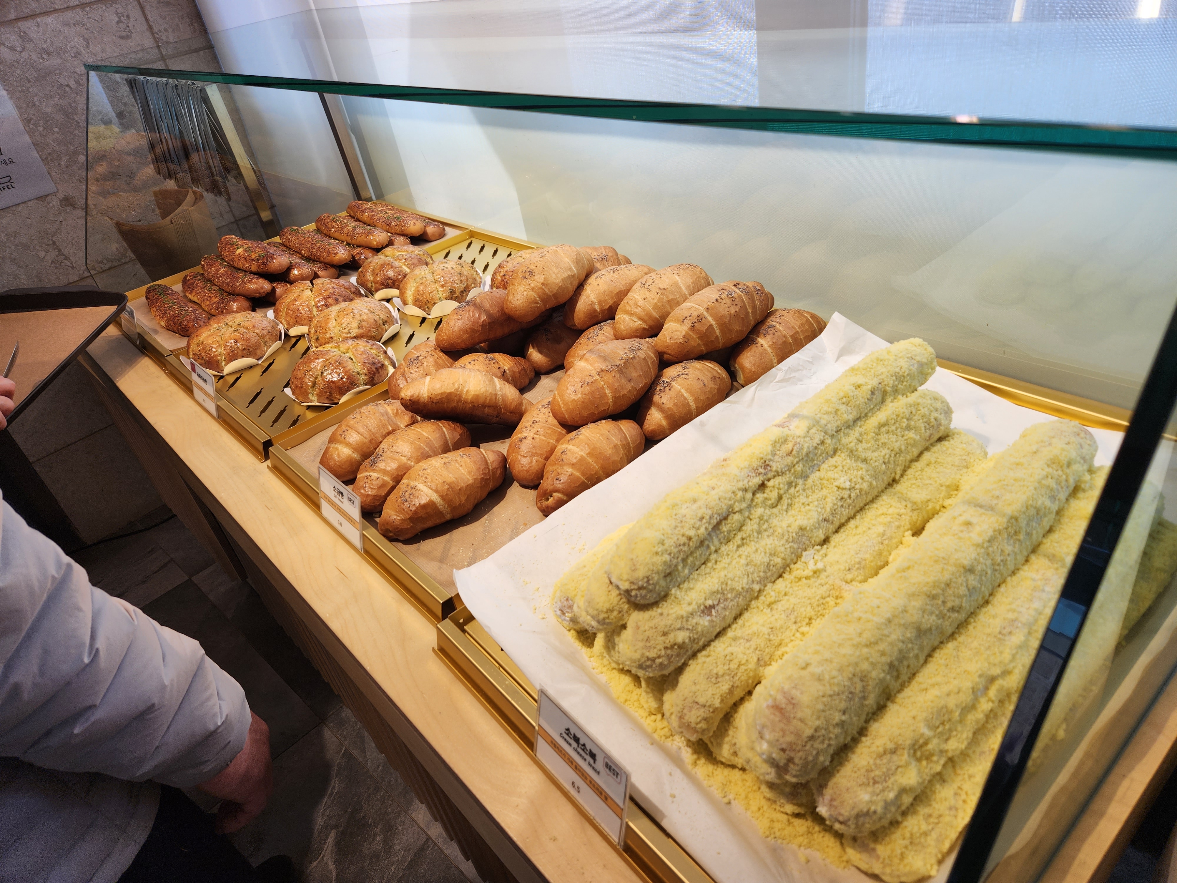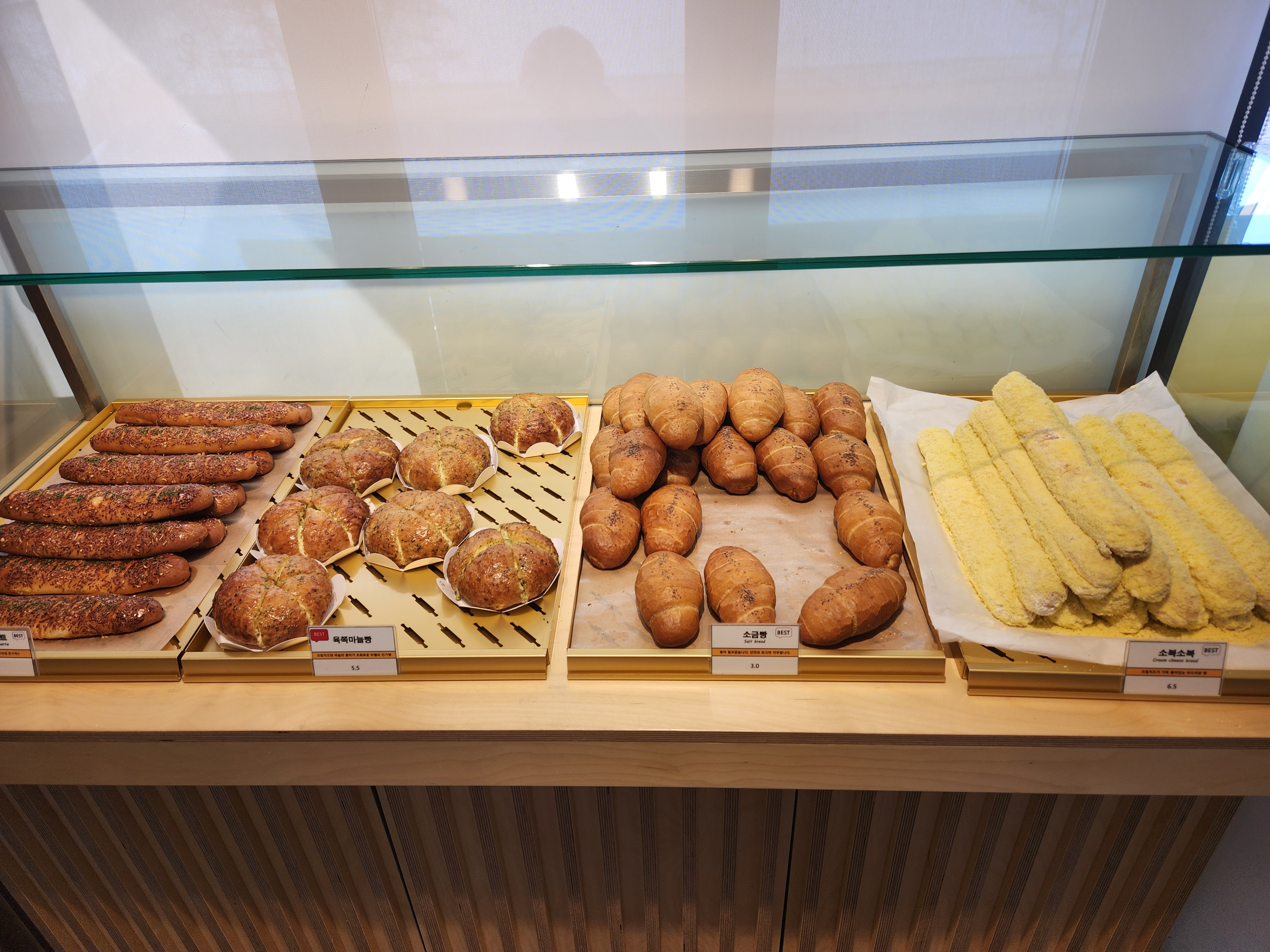 제일 왼쪽에 칸에 있는 빵들은 명란바게트,육쪽마늘빵, 소금빵, 소복소복 이렇게 4개의 종류가 있었는데