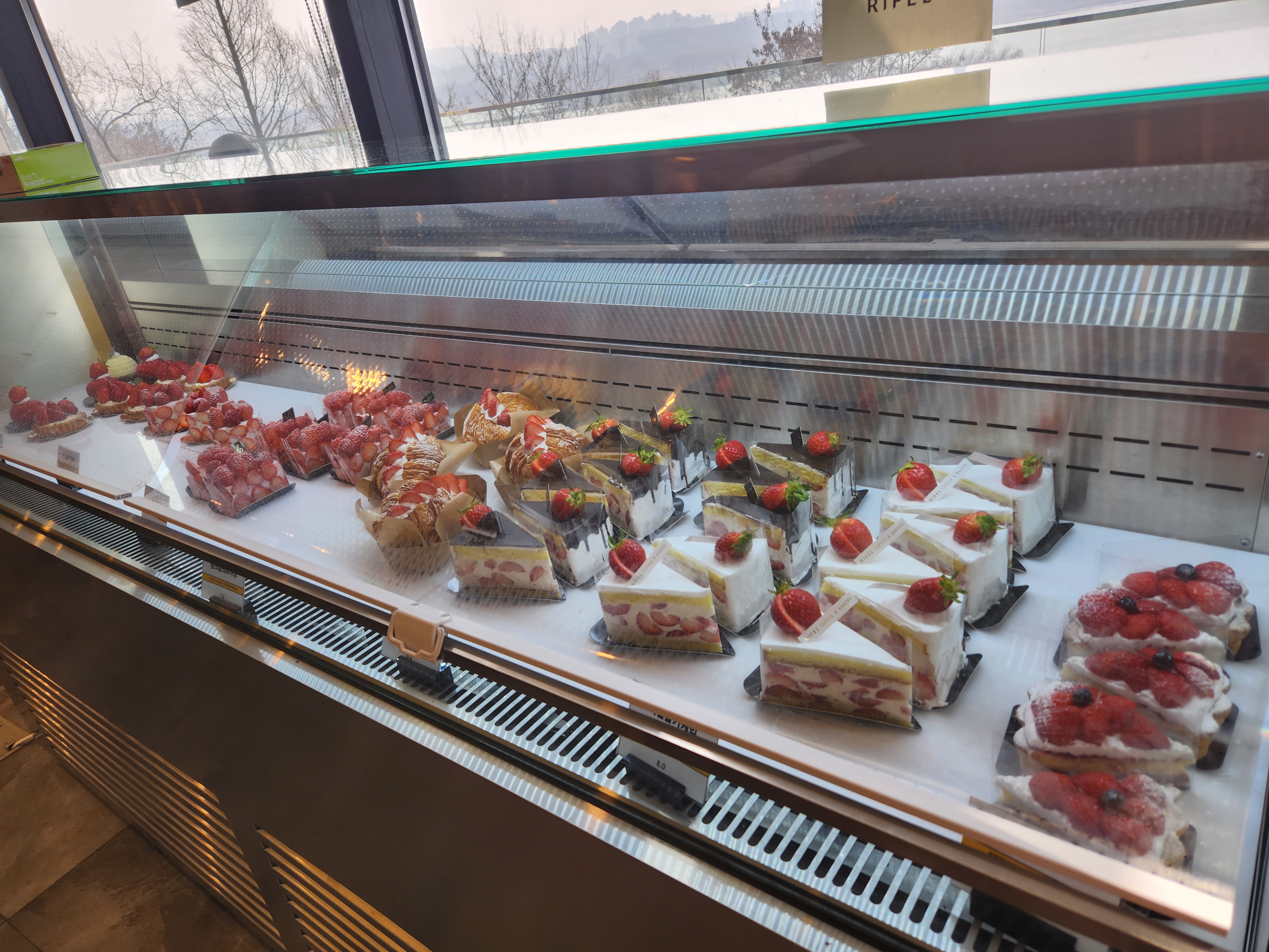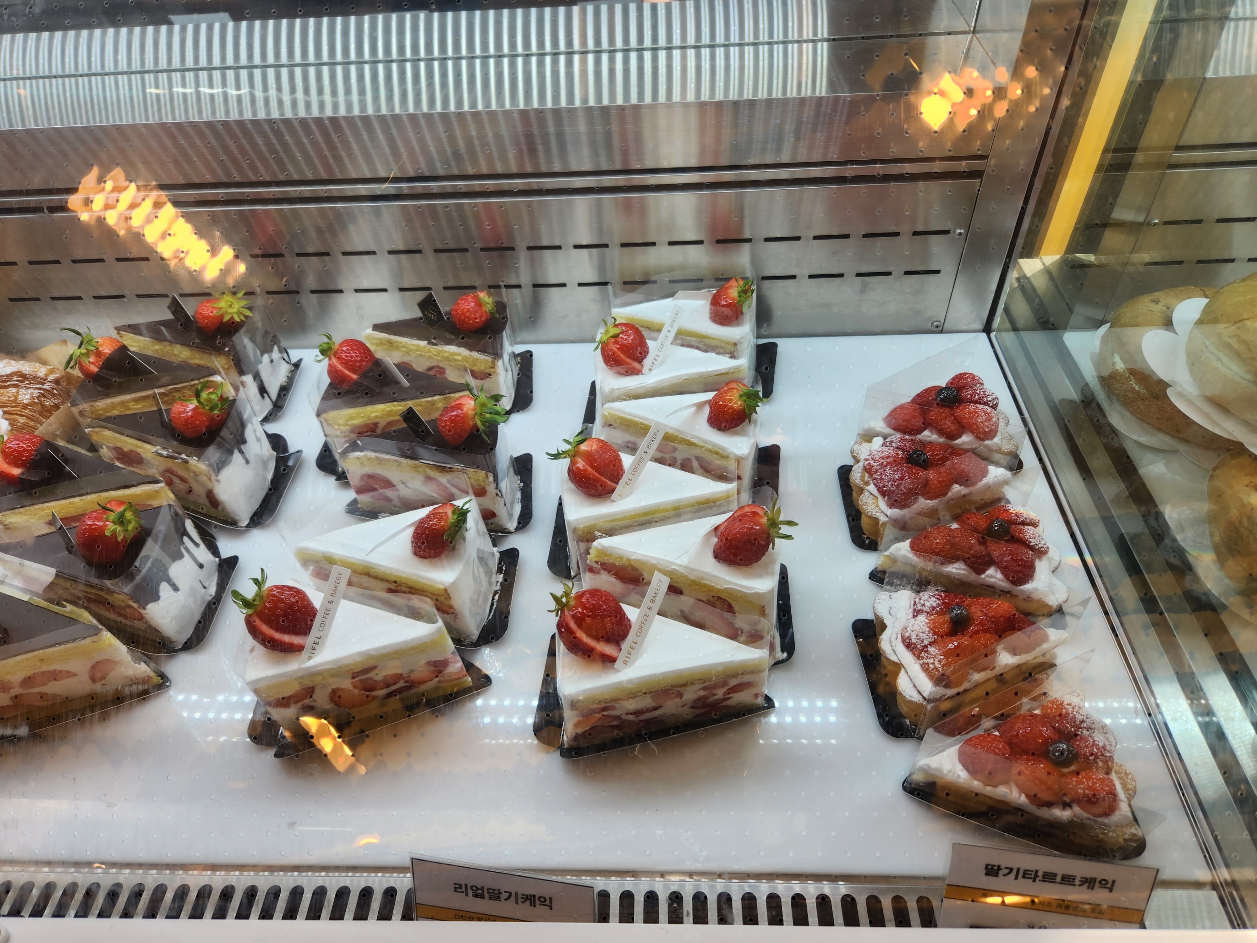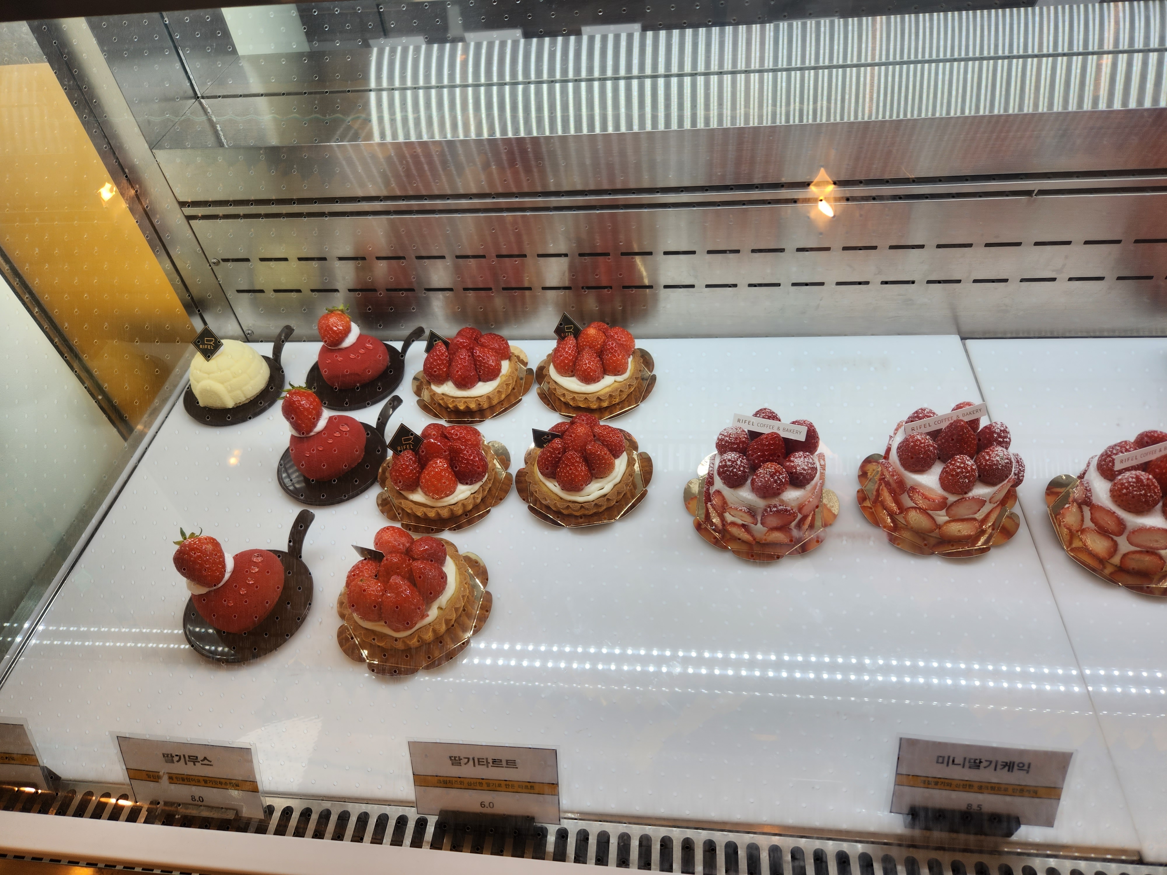 가운데 칸에는 딸기무스, 딸기타르트, 미니딸기케이크, 딸기튜브, 딸기 크로와상, 그냥 딸기 밭이었어요