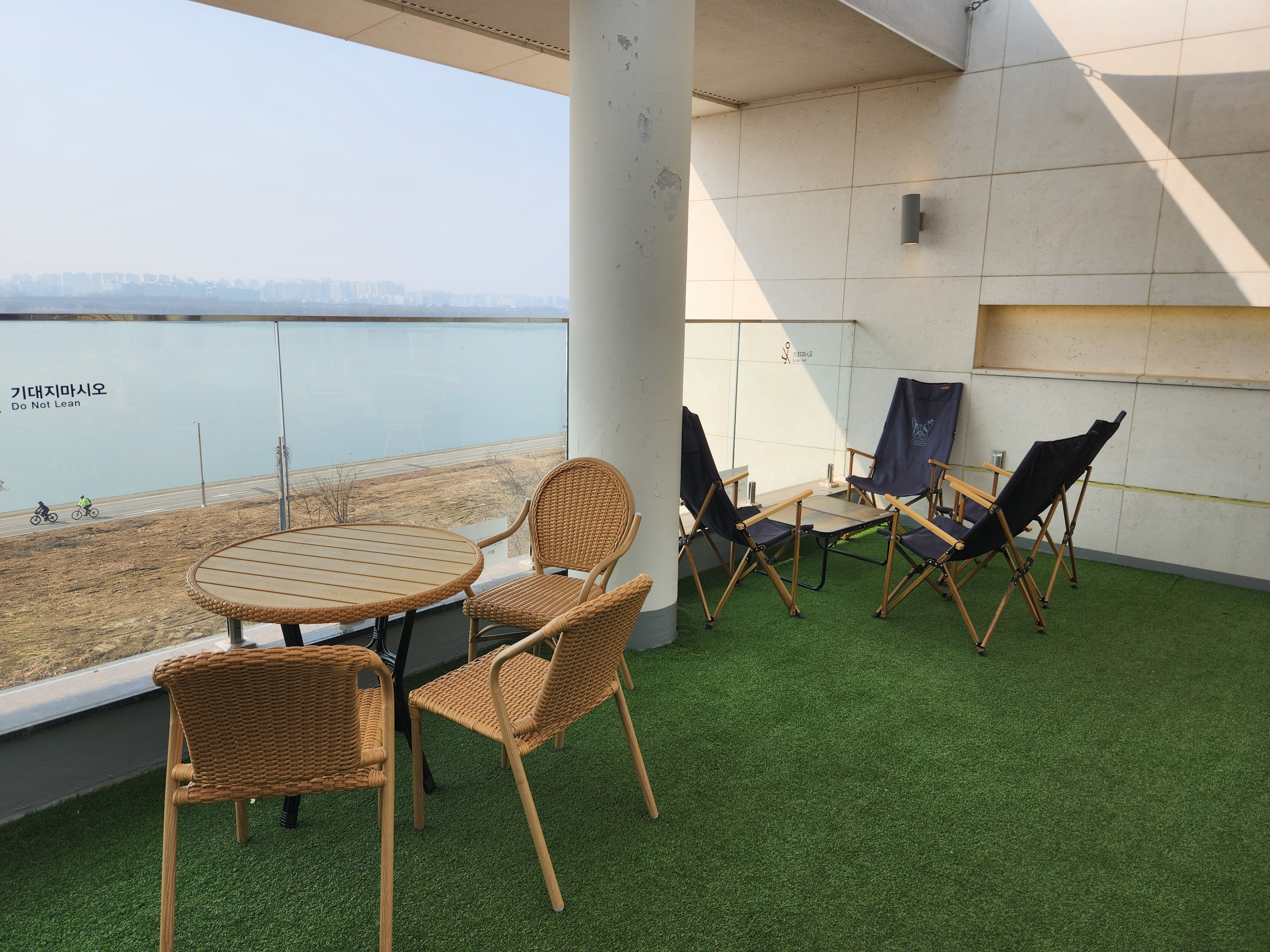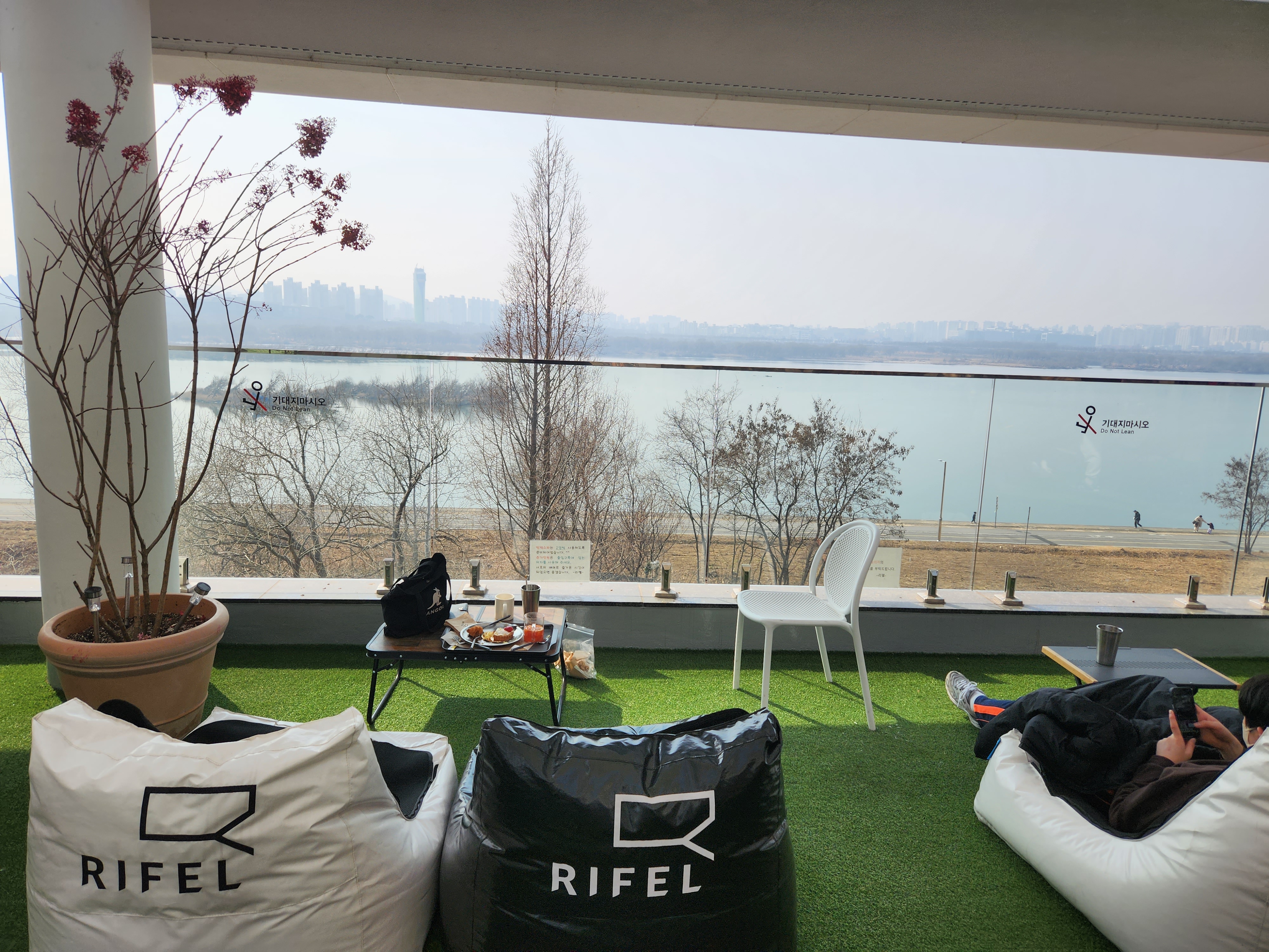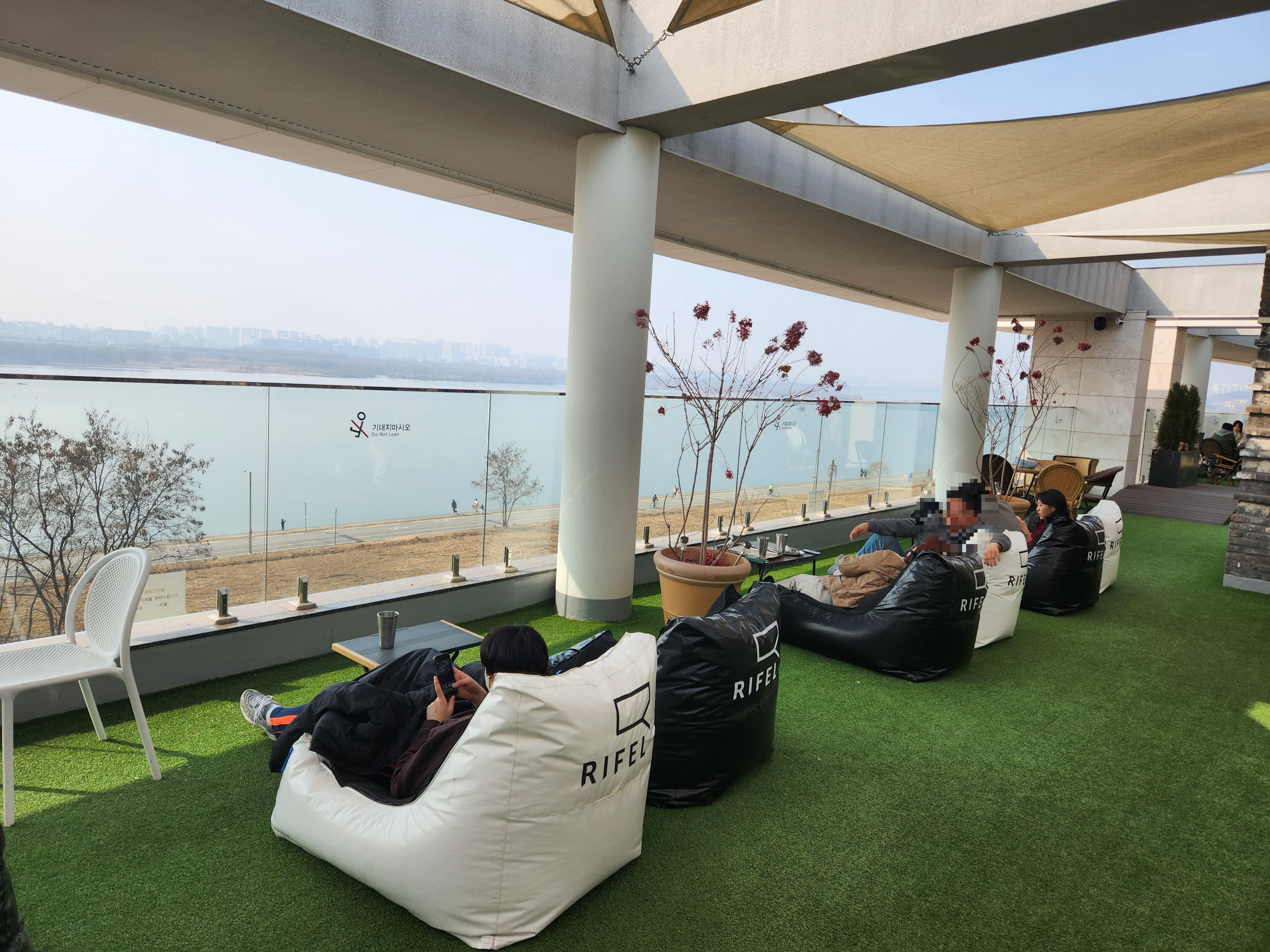 좌측 우측 가운데로 3층 루프탑에 올라갈수 있는데, 좌측공간에는 푹신한 쇼파같은 의자로 되어있는 공간이 형성되어있었습니다! 바로앞에 강 뷰 여서 이제 슬슬 날씨 풀리니까 제일 인기 많은 공간일거 같아요!