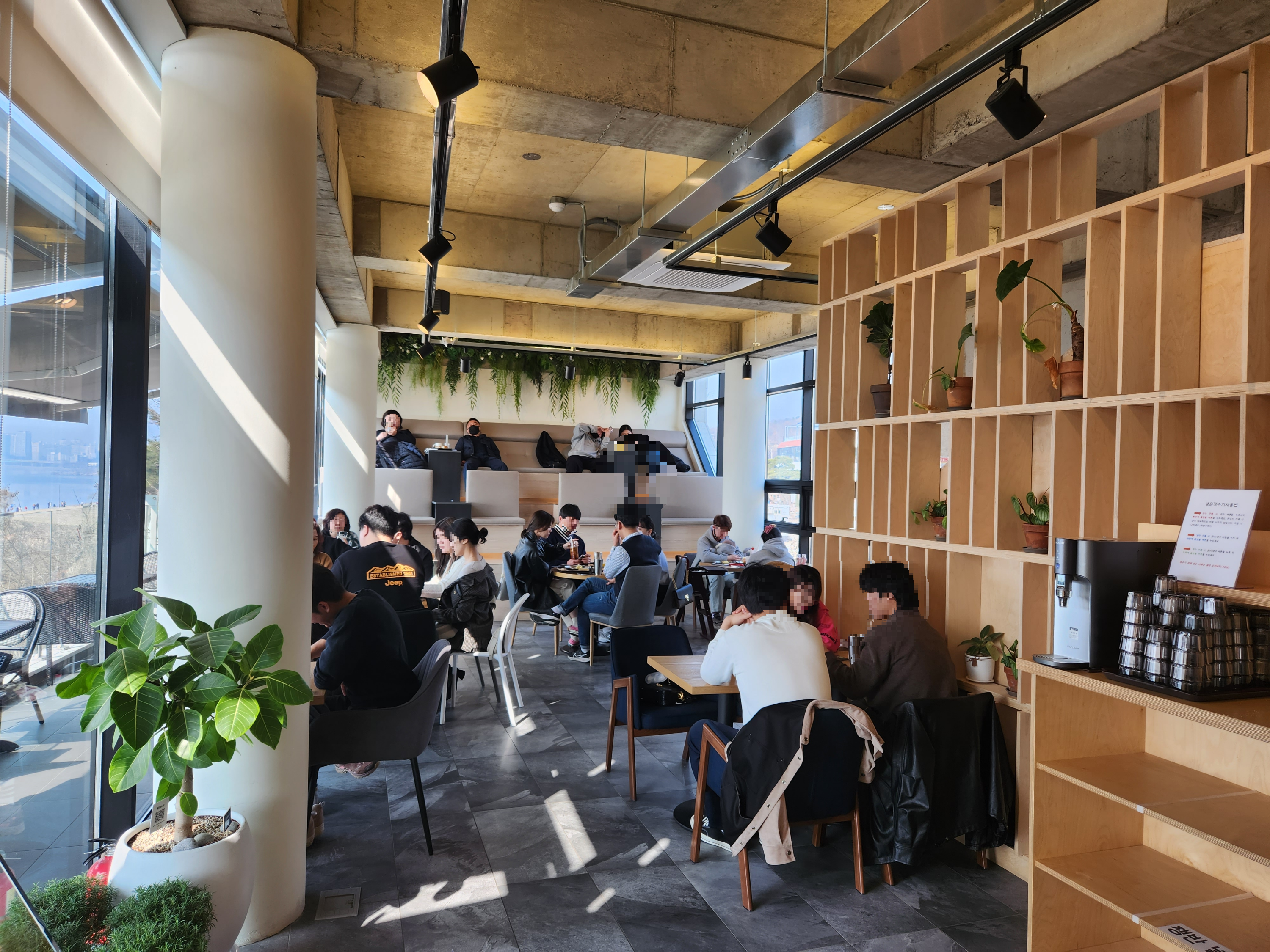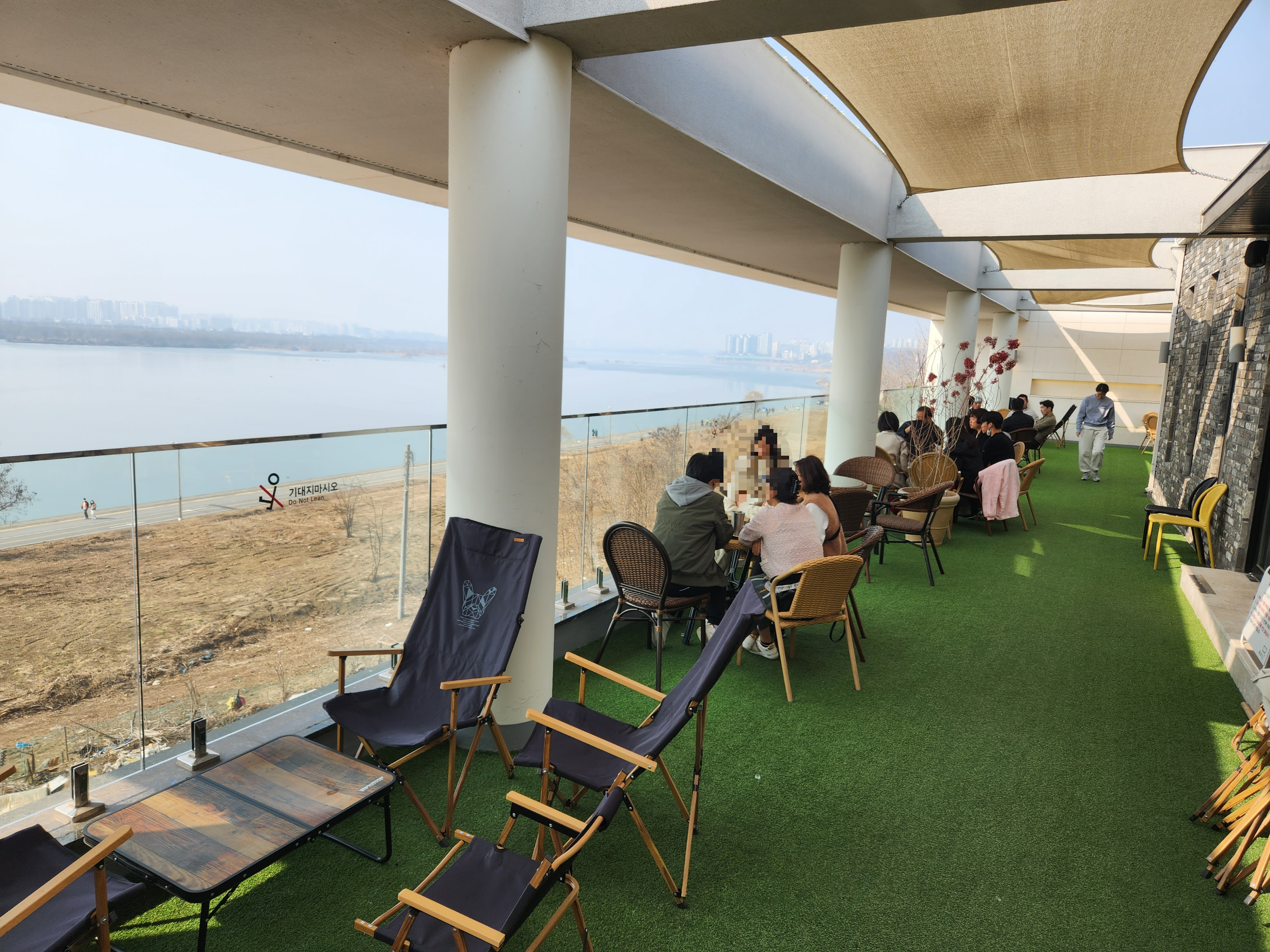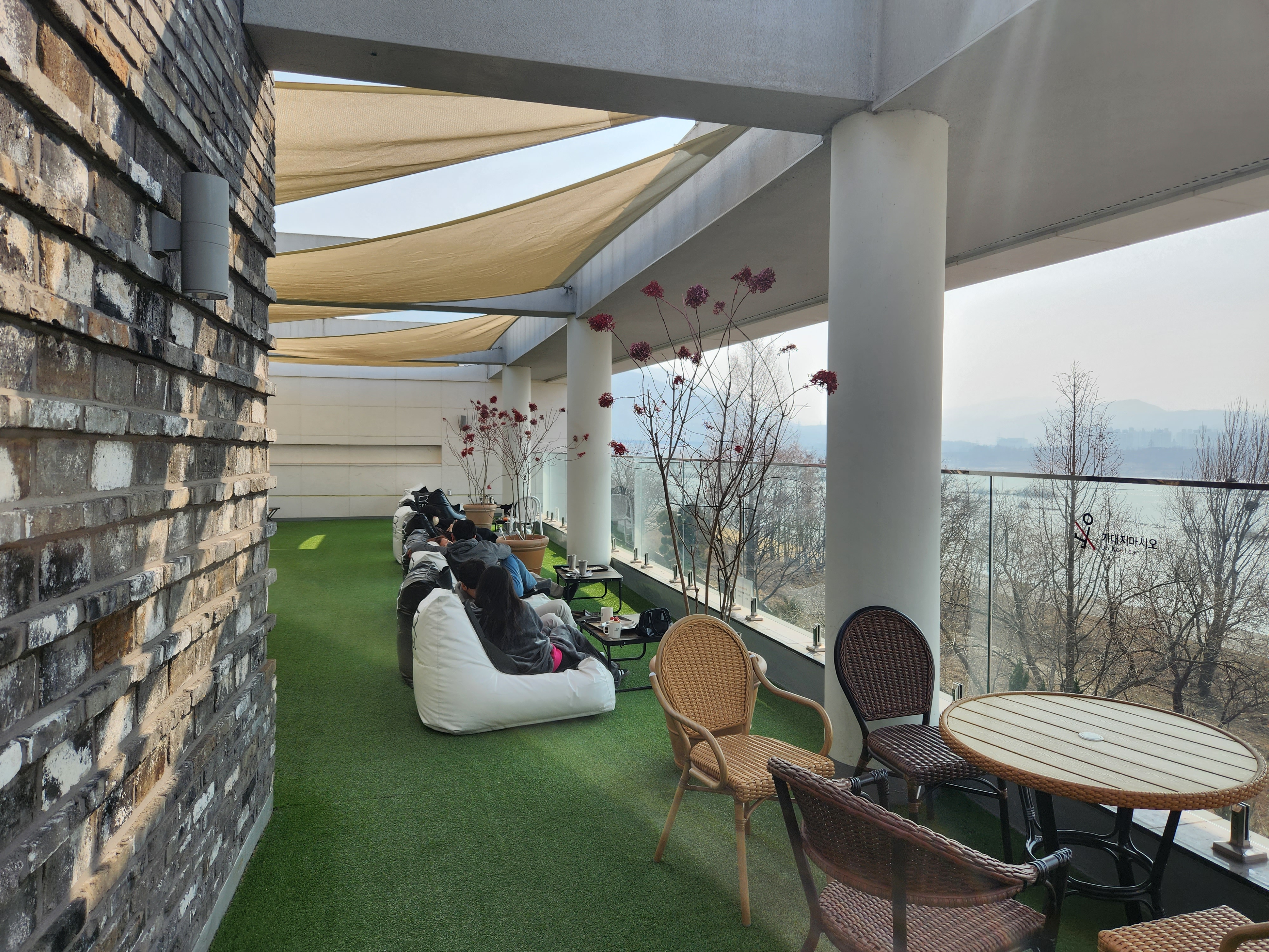 좌측 우측 가운데로 3층 루프탑에 올라갈수 있는데, 좌측공간에는 푹신한 쇼파같은 의자로 되어있는 공간이 형성되어있었습니다! 바로앞에 강 뷰 여서 이제 슬슬 날씨 풀리니까 제일 인기 많은 공간일거 같아요!