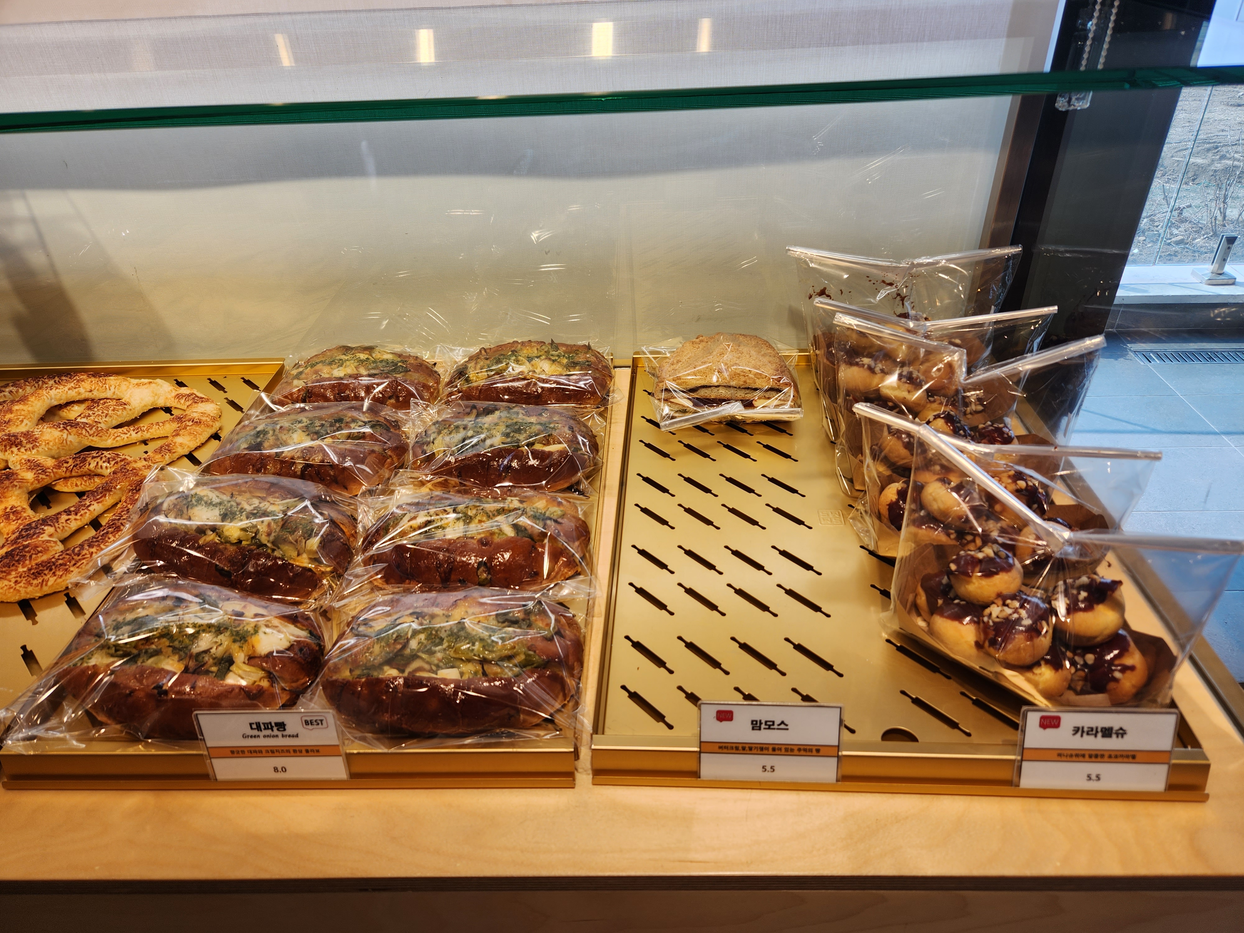 맨 오른쪽에는 휘낭시에, 몽블랑, 꿀밤빵, 에그타르트, 퀸야망(딸기, 초코, 생크림), 크로와상(초코, 코코넛), 스콘, 시나몬롤, 치아바타(치즈, 올리브), 치즈프레쉘, 대파빵, 맘모스빵, 카라멜슈 가 있었어요!