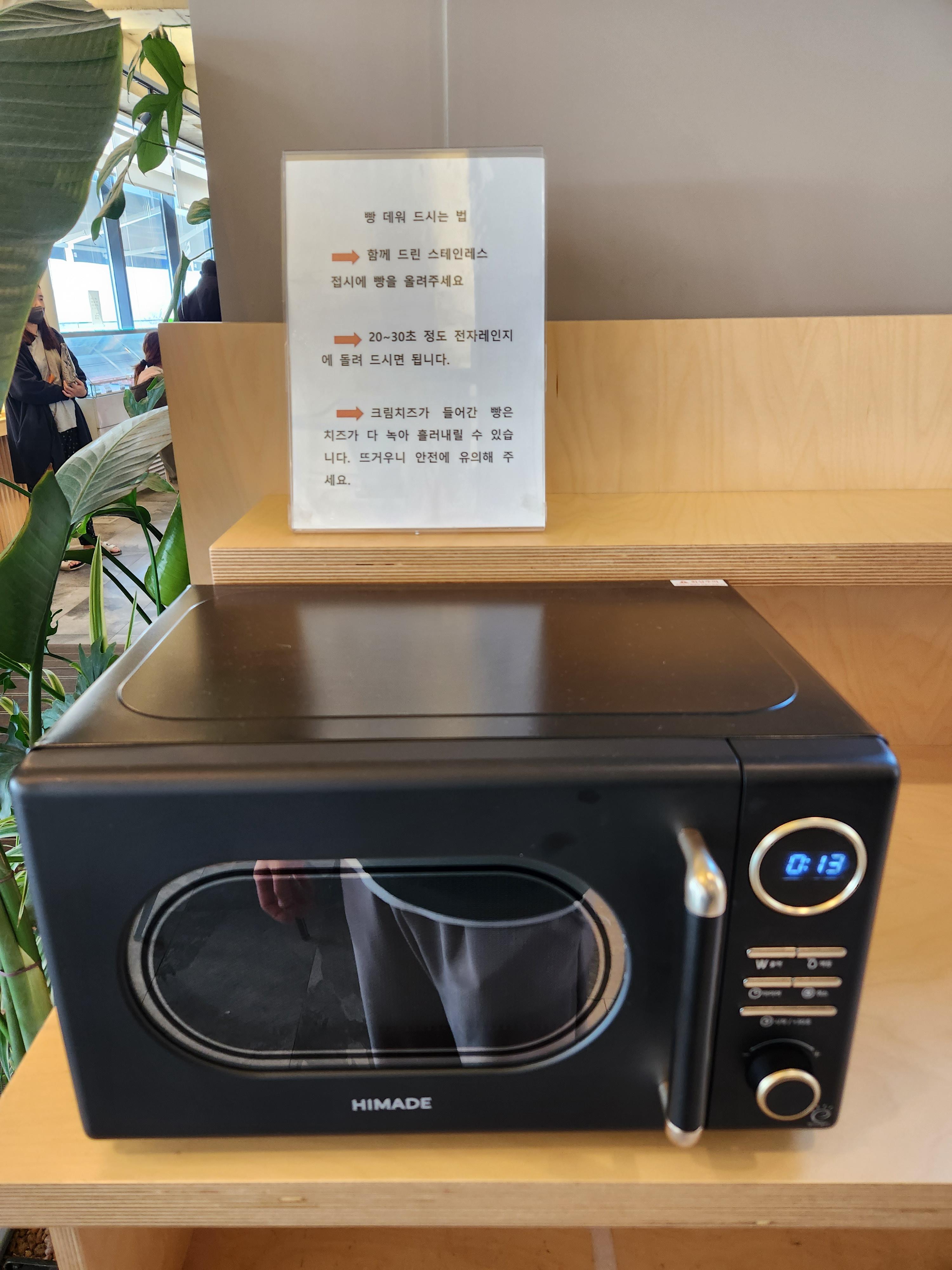 빵을 데워드실수있는 전자렌지도 있고, 정수기와 남은빵을 포장할수 있는 자율포장대가 있는데