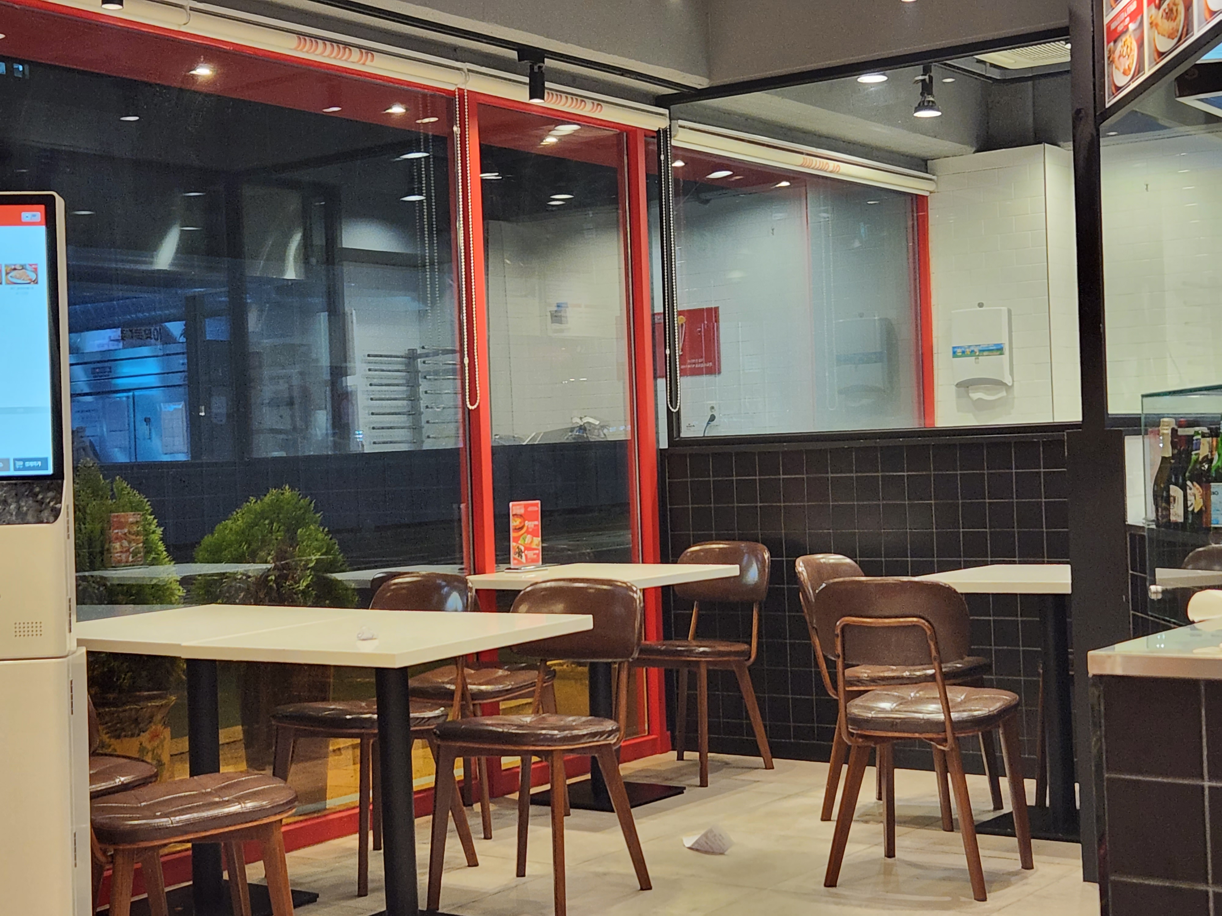키오스크로 주문을 하면되지만 메뉴판은 상단에 그림과 같이 볼수도 있고, 픽업 리턴대도 주문대와 같이 붙어있습니다!