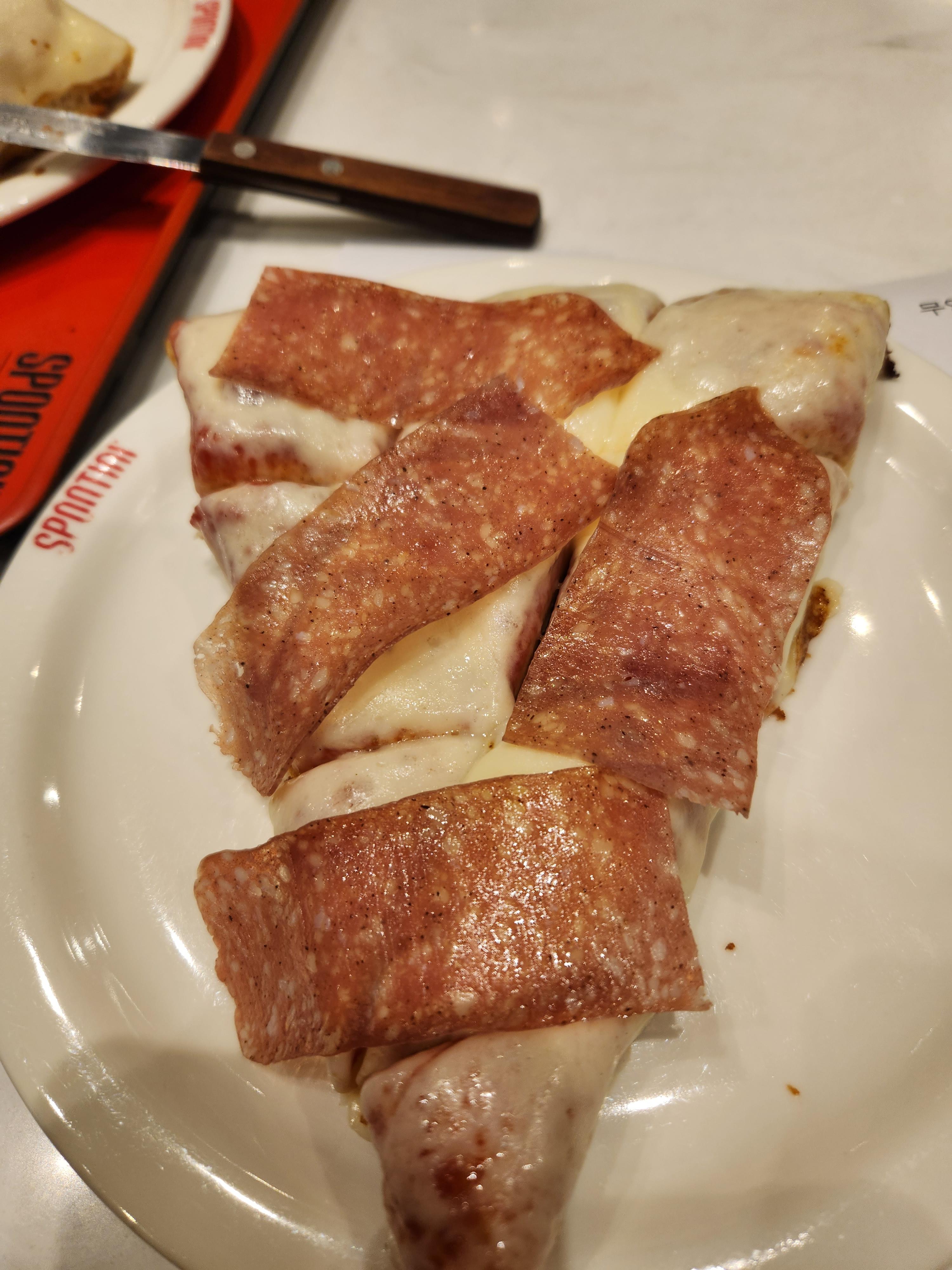 살라미 피자를 시켰는데, 여기서 느낀점은 스폰티니의 피자종류는 그냥 치즈피자에 토핑만 올라간게 메뉴로 여러개 있구나 라는거였어요!